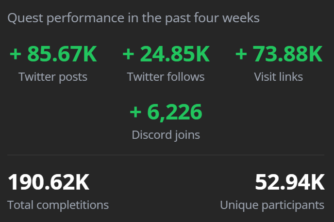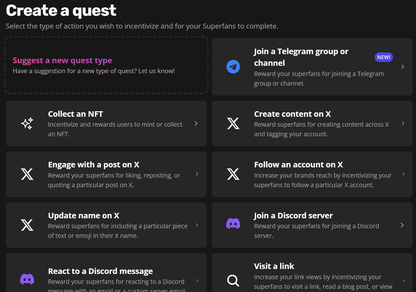 Create quests for your superfans to complete, from liking/reposting posts on your social channels, joining your Telegram, completing a survey, or getting 10 kills within your game via our API—the possibilities are endless.